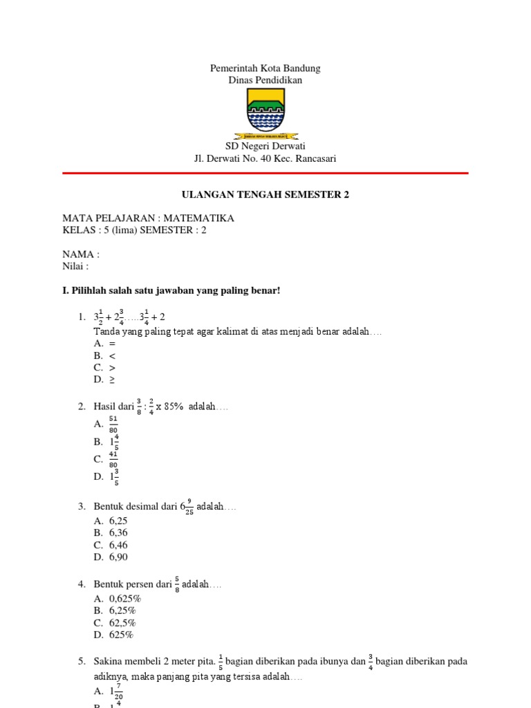 Semoga soal ulangan harian kelas 5 semester 1 diatas dapat bermanfaat secara lebih luas.