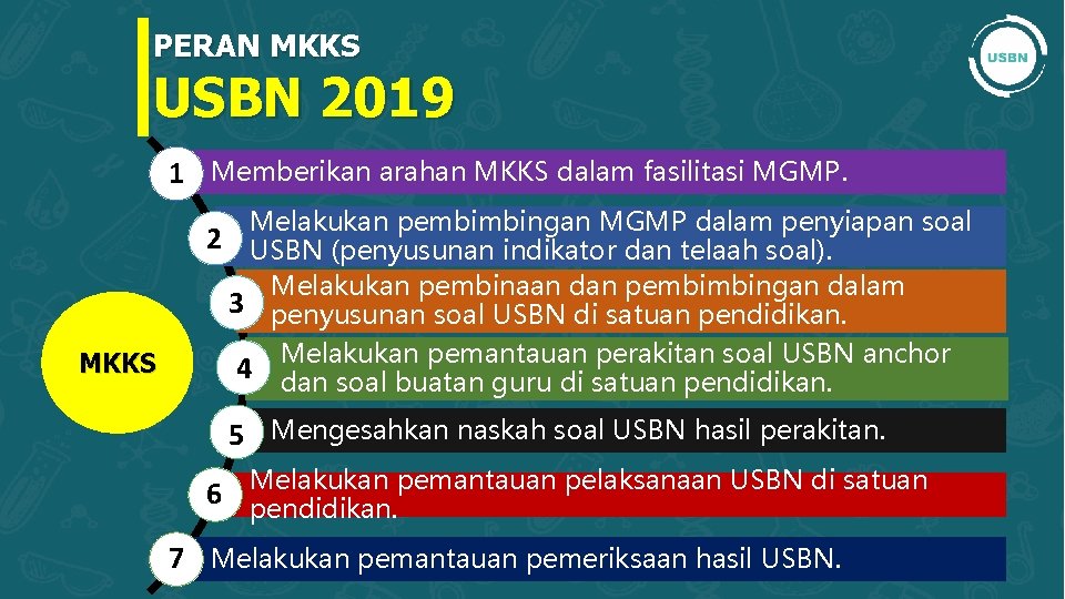 Mengoordinasi penyusunan dan perakitan soal usbn. Menunjuk guru sebagai pembuat soal ujian sekolah dasar tahun . Soal diupload oleh mgmp melalui aplikasi us paling lambat tanggal 15 februari . Dilakukan di forum mgmp terdekat yang memungkinkan, sebagai contoh . Perakitan dapat dilakukan di satuan pendidikan atau kkg/mgmp.